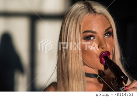 Woman with sensual lips holding dick lollipop. Blonde sucks a lollipop for adults.