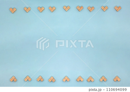 ハートの形に並べたウッドキューブが連続して上下に並ぶ水色の背景