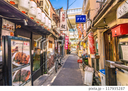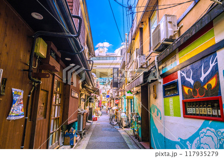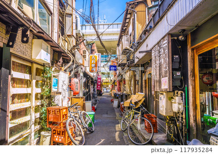 日本の東京都市景観 8月。三軒茶屋駅すぐの飲み屋街「三茶3番街」(三軒茶屋三角地帯)などを望む
