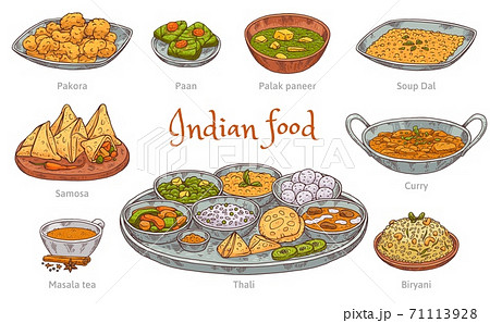 Indian food. Menu India. Curry dish. National cuisine. Restaurant meal. Delicious cooking. Tandoori and naan. Asian samosa. Masala tea. Spicy rice. Chilli or ginger. Vector dinner outline elements set