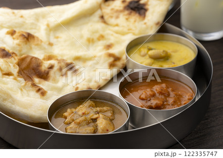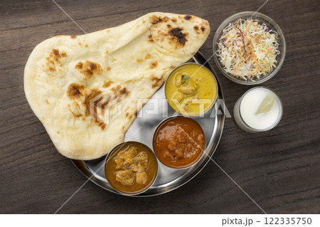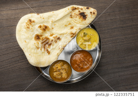 ナンと3種類のカレーセットのクローズアップ俯瞰