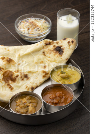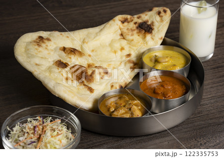 サラダとラッシーが添えられたナンと3種類のカレーセットの俯瞰