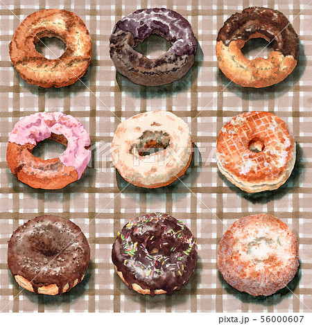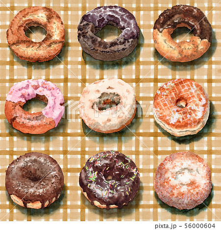 アナログ水彩で描いたチェック布の上のドーナツ9種類