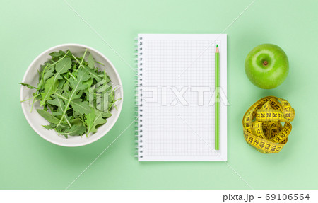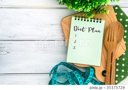 Diet plan concept. Measuring tape and diet plan on wooden background.