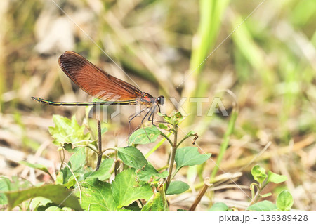 枯れ枝に止まるカワトンボ科ハグロトンボ♀