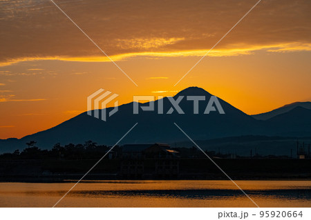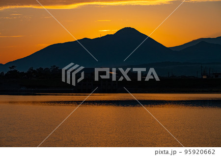 日野川河口から見る日の出前の孝霊山 鳥取県