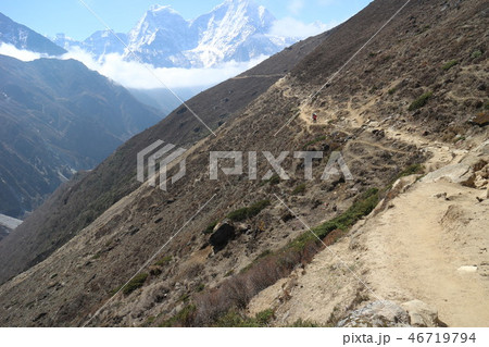 ネパールのペリチェからトゥクラ間の絶景とトレッキングする人
