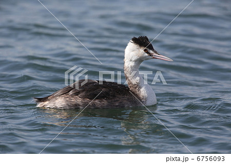 水面に浮かぶ冬羽のカンムリカイツブリ