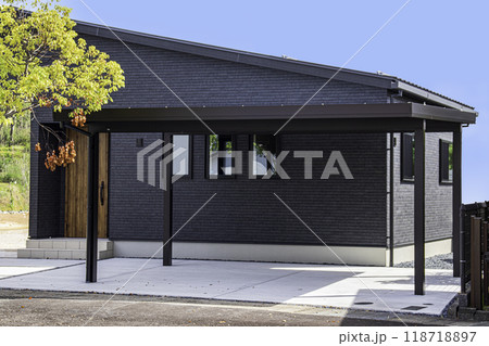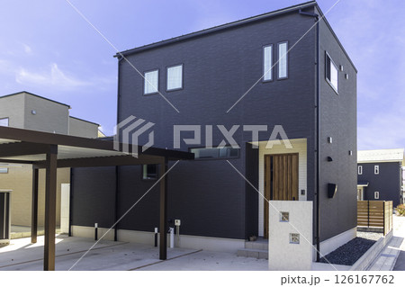 小さな庭とカーポートのある一戸建ての住宅 perming 写真素材