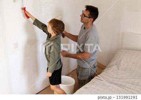 A father and his young son are painting the walls in a bedroom. The father uses a roller while the boy holds a paintbrush. They enjoy spending time together on this home improvement project