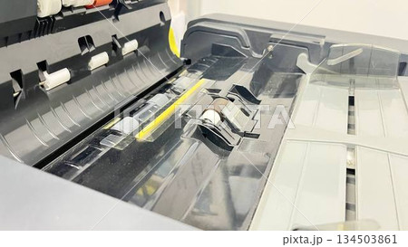A close-up of a printer's interior showing the paper feed mechanism and rollers, ideal for printer maintenance guides, technical repair content, and office machinery educational visuals.