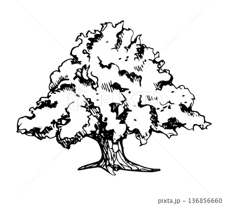 Grand tree with broad umbrella crown, thick trunk, calm mature landscape element. Oak, banyan or fig. Hand drawn in ink vector illustration. Winery branding, countryside artwork, eco storytelling.