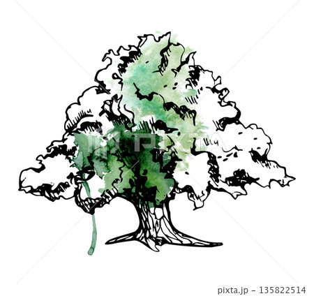 Grand oak, banyan tree with broad umbrella crown, domed canopy and thick trunk, calm mature landscape element. Ink and watercolor bleed illustration hand drawn for winery branding, countryside artwork