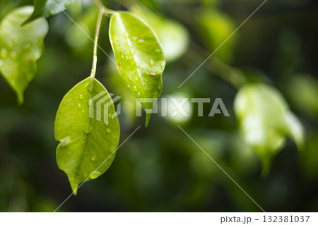Fresh Thai Ficus Leaves With Water Droplets After Rain, Lush Thai ficus leaves gleam with water droplets rain, sunlight each bead, perfect for a nature photography or tropical freshness showcase.