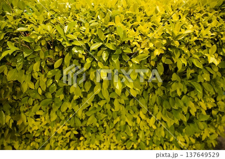Dense hedge of Ficus microcarpa with bright yellow leaves