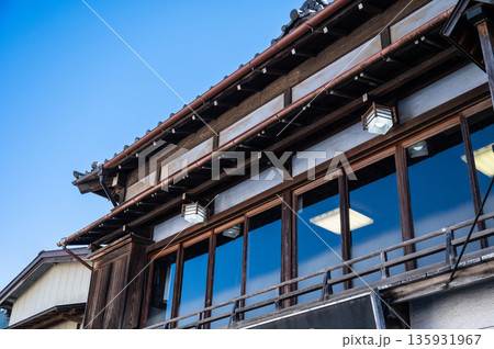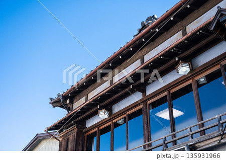空に映える日本の古民家建築と外廊下のある風景