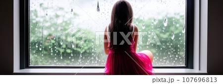 Raindrops like tears. Sad lonely latina girl sit on windowsill in melancholic mood watch rain outside feeling stress. Pensive young girlsuffer of unanswered first love. Copy space. Banner. AI