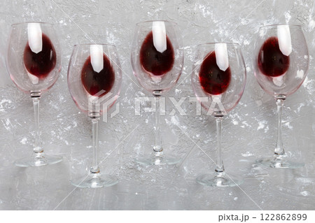 Many glasses of red wine at wine tasting. Concept of red wine on colored background. Top view, flat lay design
