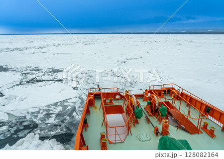 北海道紋別市 流氷原をドリルで砕いて進む砕氷船のガリンコ号の先端