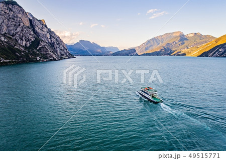 Aerial drone view on car ferry on Lake Garda in