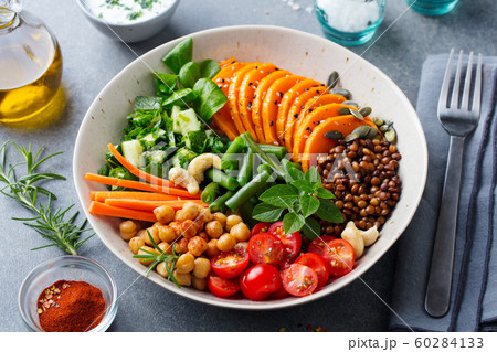 Healthy vegetarian salad. Buddha bowl. Grey background. Close up.