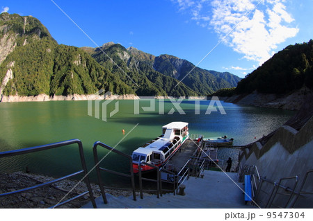 富山県の黒部ダムの黒部湖遊覧船「ガルベ」から望む湖面と紅葉と青空