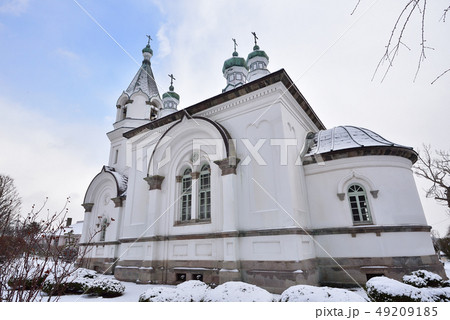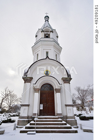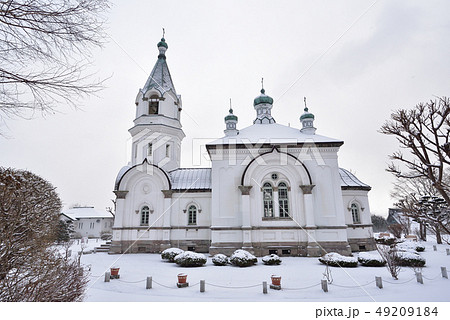 早春三月の雪の朝の北海道函館市元町ハリストス正教会の風景を撮影