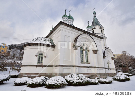 早春三月の雪の朝の北海道函館市元町ハリストス正教会の風景を撮影