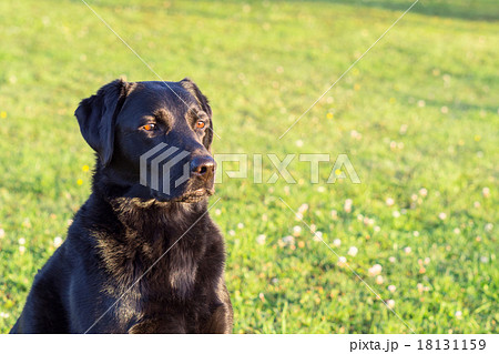 午後の牧場にたたずむ黒ラブラドルレトリバー