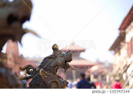 ネパールの古い寺院を守る獅子のブロンズ像(神聖なガーディアン)