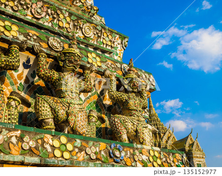 ワット・アルンのヤック像と青空 タイのバンコクの寺院装飾