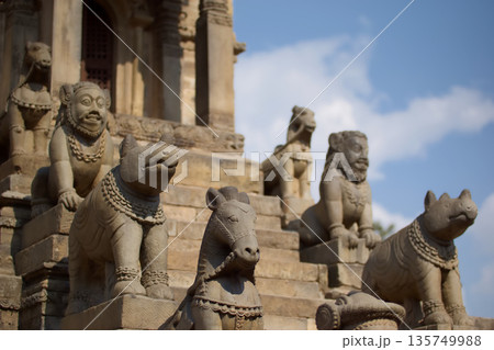 ネパールの寺院の階段に並ぶ石造りの守護獣