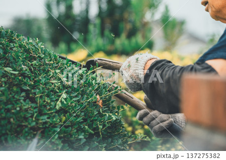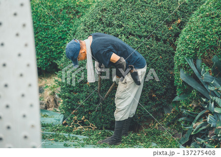 庭木を剪定する庭師・造園業・ガーデナー・植木屋・樹木屋の男性(ガーデニング)