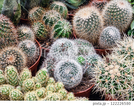 Cacti collection showcasing various species in terracotta pots at a horticultural center during daylight