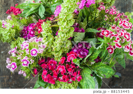 bouquet of garden Turkish carnations in a vase on a wooden background