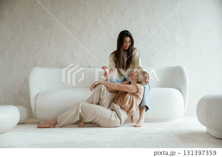 Affectionate and joyful couple in matching white t-shirts embracing lovingly