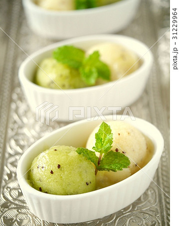 グリーン&ゴールドキウイのジェラート シルバートレイ (ハイアングル)