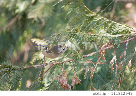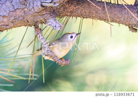 松の木で餌を探して飛び回る日本最小の鳥可愛いキクイタダキ(ウグイス科)。 東京都文京区小石川植物園