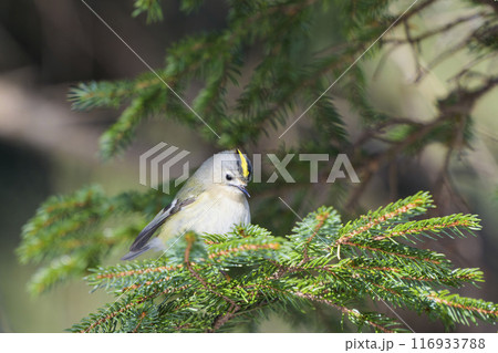 針葉樹の木の中で餌を探して飛ぶキクイタダキ