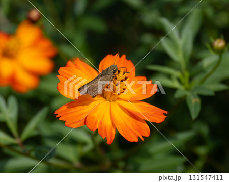キバナコスモスの花にとまるセセリチョウ