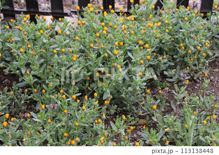 早春の庭に咲く黄色いヒメキンセンカ(冬知らず)の橙色の花