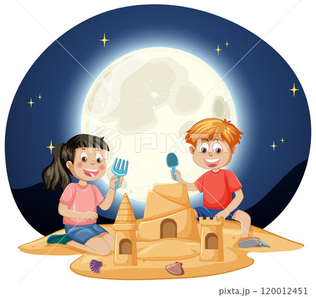Children delightfully creating a sandcastle at a sunny beach during their vacation