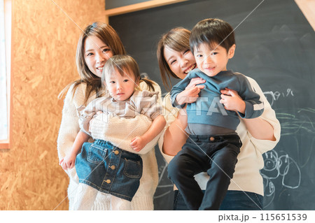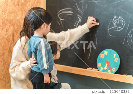 キッズスペースの黒板でお絵描きする子供と母親(託児所・学童保育・保育園・幼稚園)