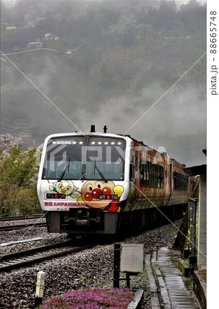 土讃線 大歩危駅の風景(春の雨上がり)特急南風(アンパンマン号 キハ2000系)