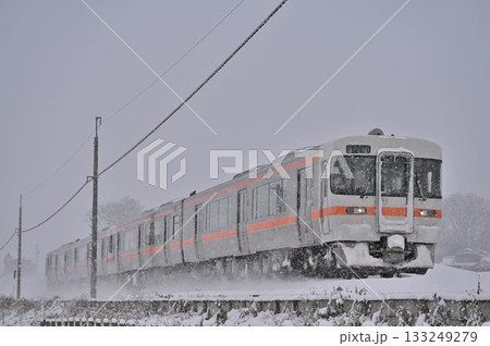 冬景色の飛騨川沿いを走る高山本線普通列車