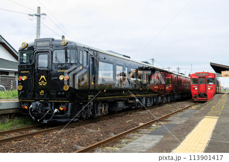 うきは駅で行き違う観光列車「かんぱち・いちろく」とキハ220形気動車(JR九州)