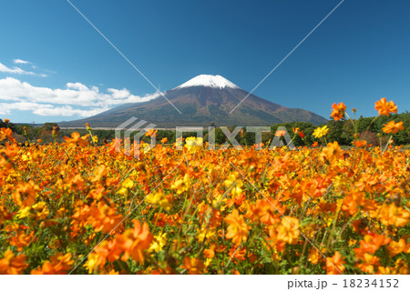 山梨県南都留郡山中湖村山中 花の都公園満開のキバナコスモスと後ろにそびえる富士山
