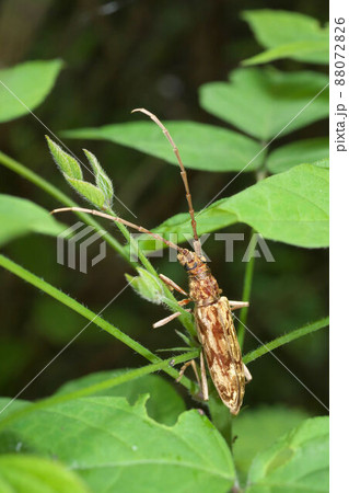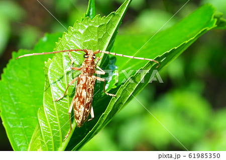 葉にとまるキマダラミヤマカミキリ