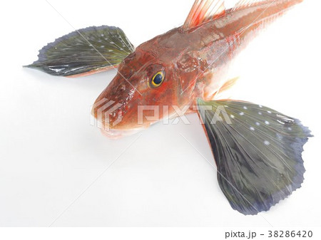 ホウボウ 半身横俯瞰 鰭閉じ 胸びれが発達した脚で海底を歩く魚 白身の高級魚