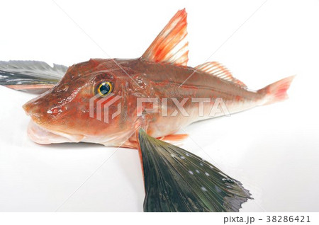 ホウボウ 全身上部 鰭閉じ 胸びれが発達した脚で海底を歩く魚 白身の高級魚